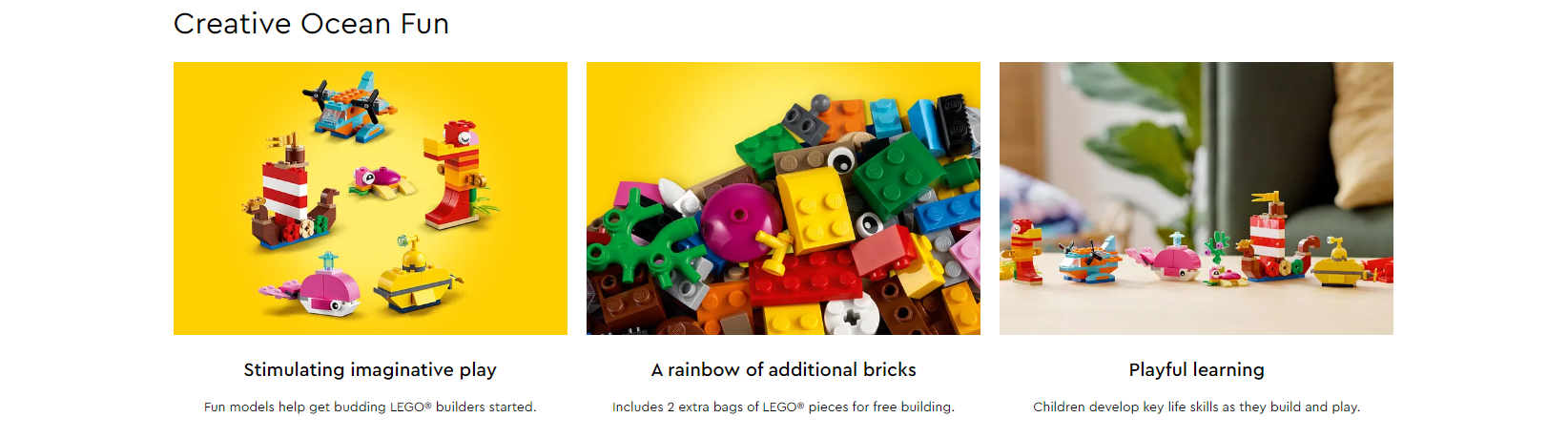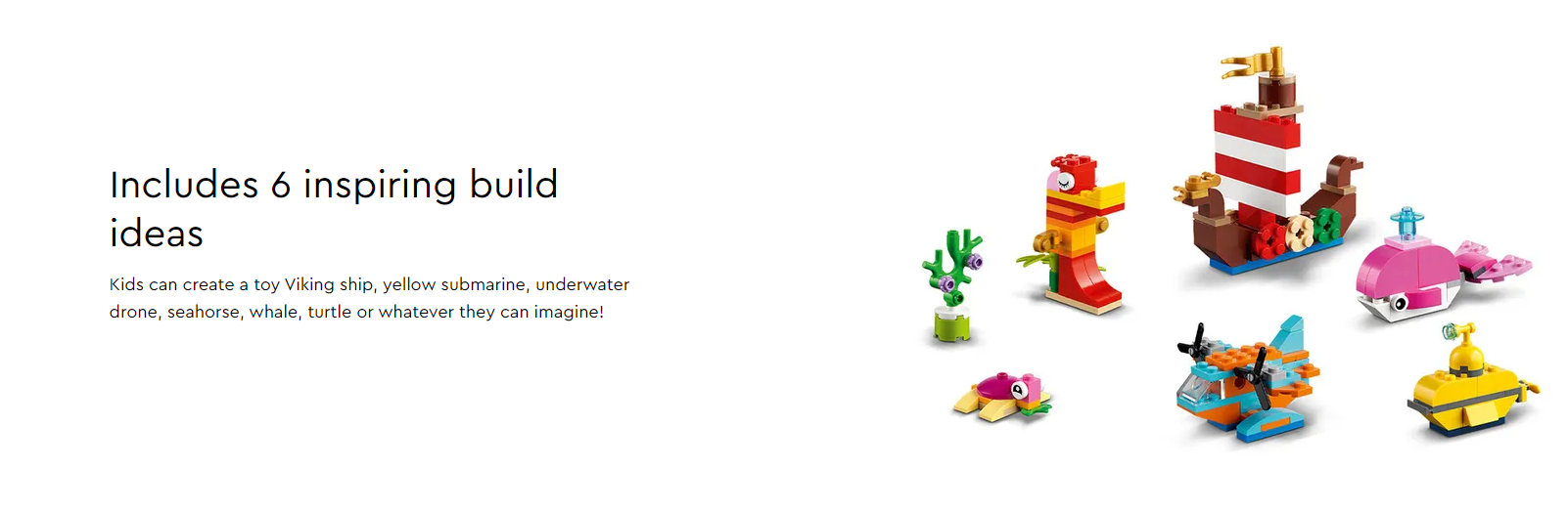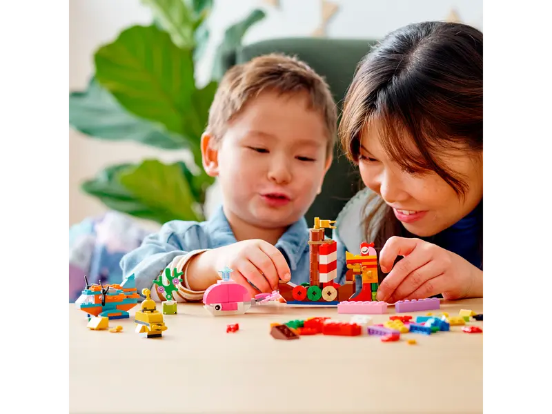 Introduce youngsters to the open-ended world of imaginative play with the LEGO® Classic Creative Ocean Fun (11018) toy playset, featuring a colorful selection of LEGO pieces and 6 inspiring ocean-themed build ideas to kick-start the fun, plus 2 bags of extra bricks for free building.