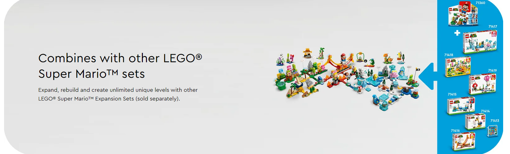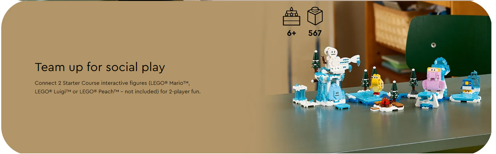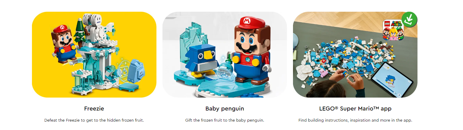 Children can add an exciting ice level to their LEGO® Super Mario™ world with the Fliprus Snow Adventure Expansion Set (71417), featuring 4 Super Mario™ characters. Players earn digital coins for helping their LEGO® Mario™, LEGO® Luigi™ or LEGO® Peach™ figures (not included) defeat a Red Koopa Troopa, Freezie and a Fliprus, skate on ‘ice’, warm up by the ‘fire’ and give a hidden fruit element to the baby penguin as a gift. (Note: the 71360, 71387 or 71403 Starter Course is required for play.)