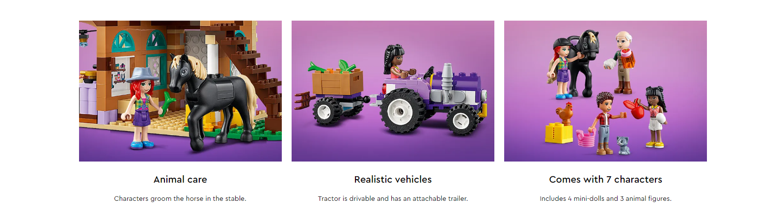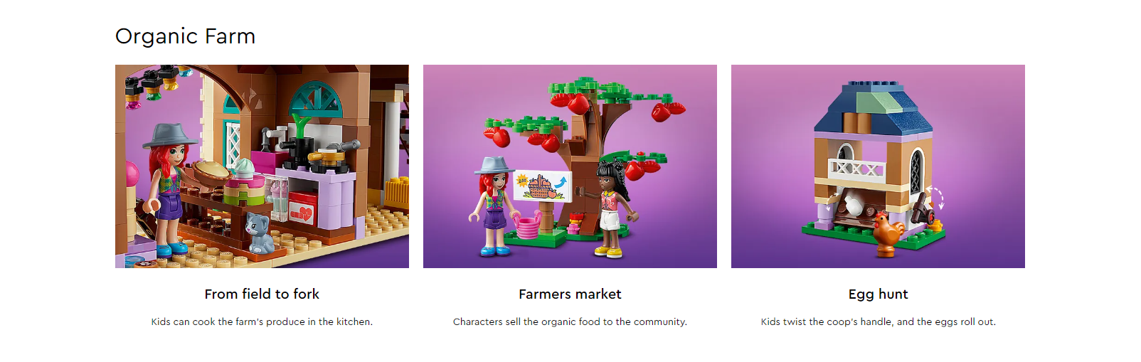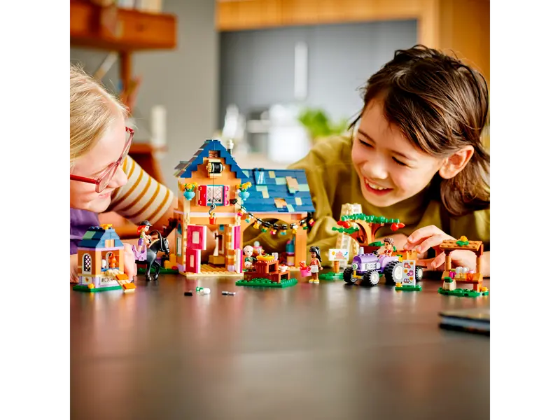 The farmhouse has removable elements so kids can ‘mend’ the roof with their tools. The mini-dolls harvest vegetables with the tractor and its attachable trailer, and care for the LEGO® farm animals. In the kitchen, kids who love making healthy food can pretend to prepare home-cooked meals or jam to sell on the stall.