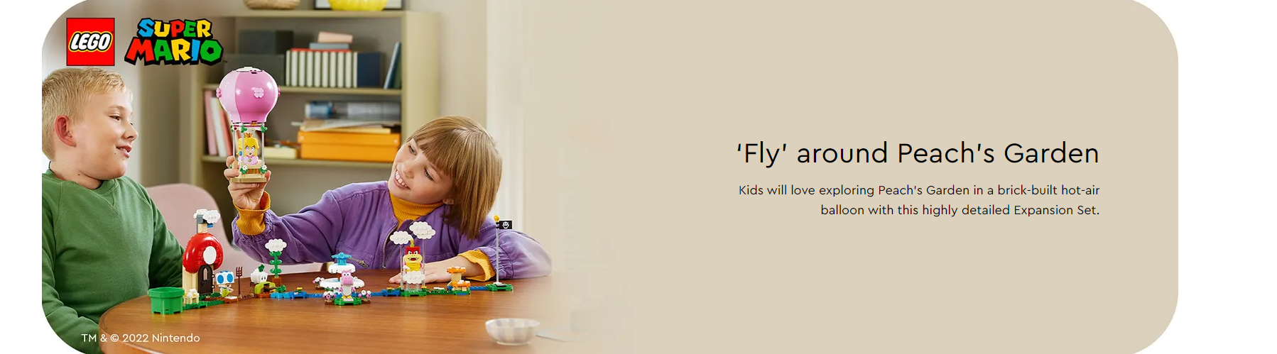 Add extra coin-collecting challenges and role-play fun to kids’ LEGO® Super Mario™ world with the Peach’s Garden Balloon Ride Expansion Set (71419). Players can explore the detailed garden with their interactive LEGO® Peach™, LEGO® Mario™ or LEGO® Luigi™ figure (not included) in the brick-built hot-air balloon. Cool features include a Blue Toad’s house with a Super Star Block in the chimney’s ‘smoke’, a fountain with a Coin Block, and clouds over Pom Pom to part with the balloon. (Note: the 71360, 71387 or 71403 Starter Course is required for interactive play.)