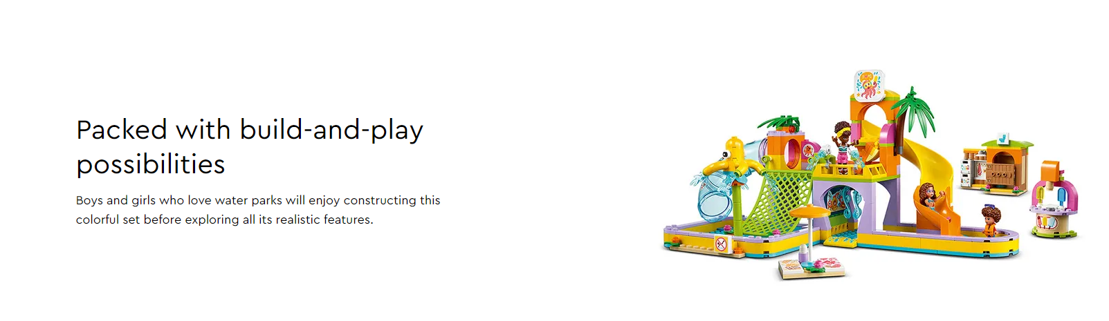 Kids who enjoy summer fun will love the LEGO® Friends Water Park (41720). Little builders aged 6+ can recreate the fun thrills of the outdoor pool with this brick-built model that’s filled with cool toys for hours of creative play.