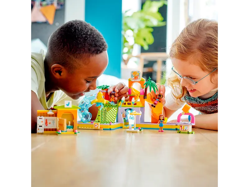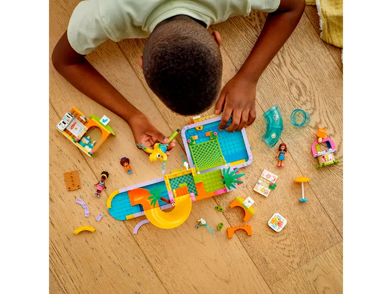 There are lots of realistic features to explore, including 2 slides, a spraying octopus, waterfall shower and a grotto with an aquarium. Away from the splash action is a cute changing area complete with a shower and restroom. LEGO Friends Olivia, Santiago and Nandi can cool down with a treat from the popsicle stand and relax under the sunshades.